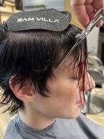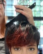 - Comb all of the top hair forward and slide cut in a crisscross pattern to create additional root movement.